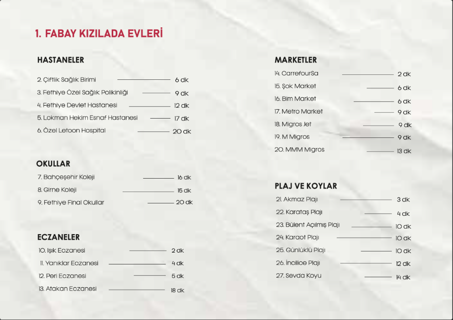 FABAY Kızılada Evleri, Fethiye merkezine yaklaşık 12 dakikalık mesafede bulunur. Araçla yaklaşık 10 dakikada Fethiye merkezine ulaşılabilir. Bölgedeki yerel lezzetleri keşfetmek ve zengin Akdeniz mutfağının tatlarıyla buluşmak mümkündür. Kızılada bölgesi; orman dokusu, temiz havası ve korunmuş peyzajıyla dört mevsim doğayla iç içe bir yaşam sunar. Kızılada’da yaşamak, doğanın en özel anlarına komşu olmaktır.